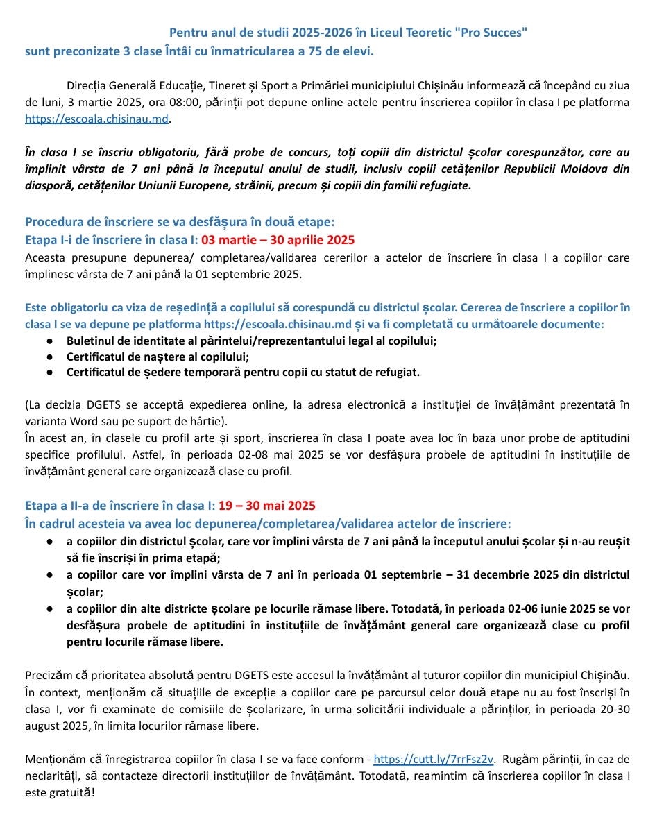 Pentru anul de studii 2025-2026 în Liceul Teoretic "Pro Succes" sunt preconizate 3 clase Întâi cu înmatricularea a 75 de elevi.