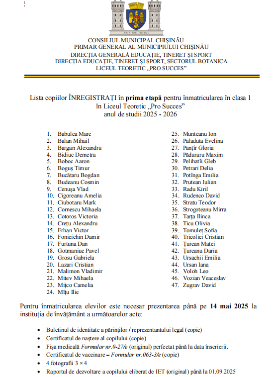 Liste elevilor ÎNREGISTRAȚI în prima Etapă pentru înmatricularea în clasa I, anul de studii 2025-2026